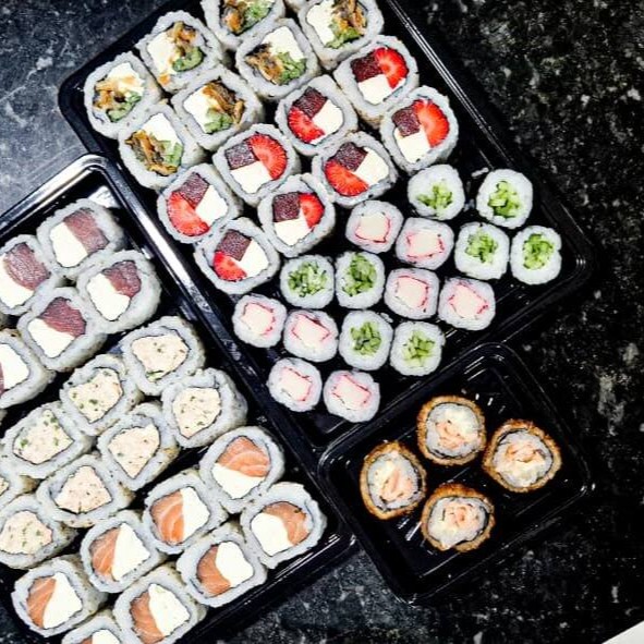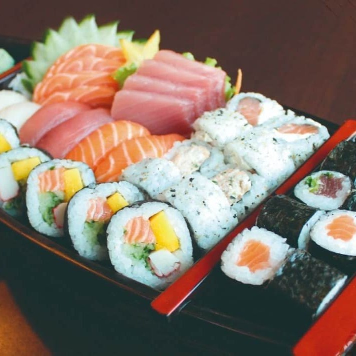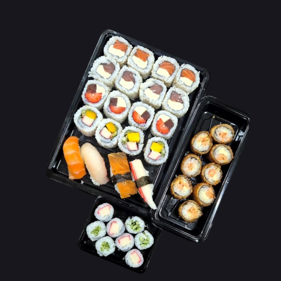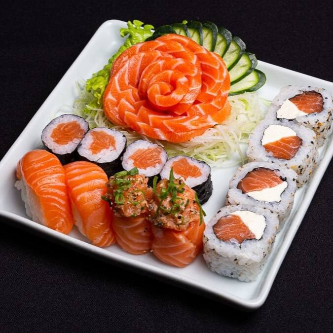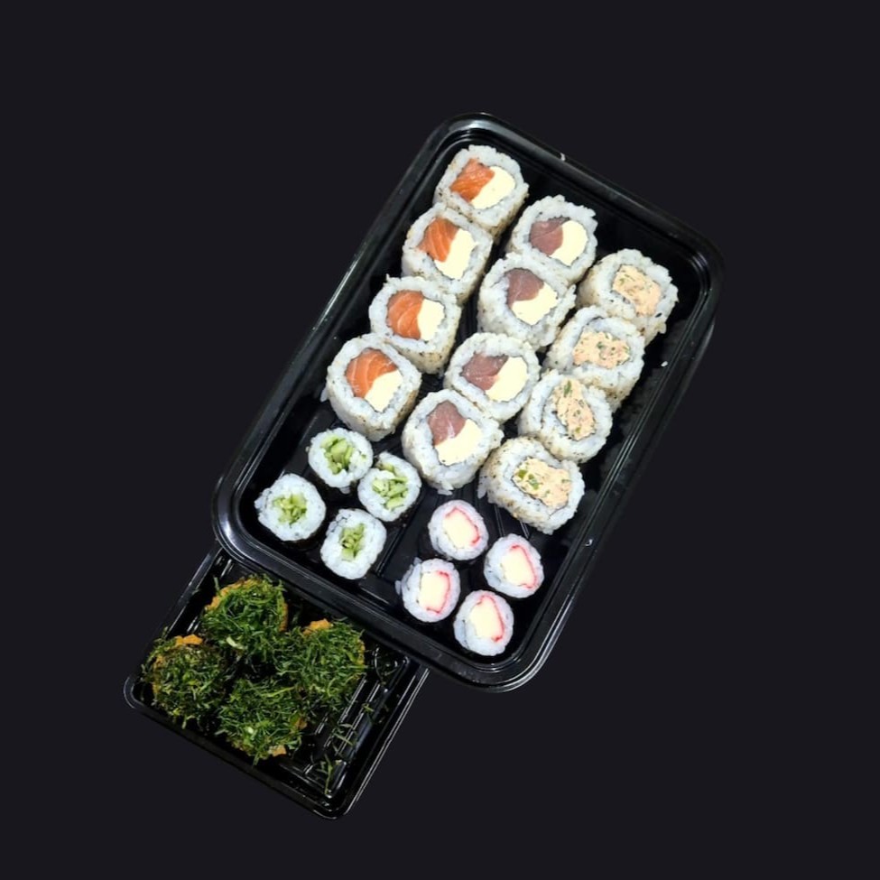 35 unidades - 4 fatias de salmão, 4 fatias de atum, 6 nigiris mistos, 4 salmão filadélfia, 4 nirumaki, 4 tekka, 4 shake e 5 futomaki