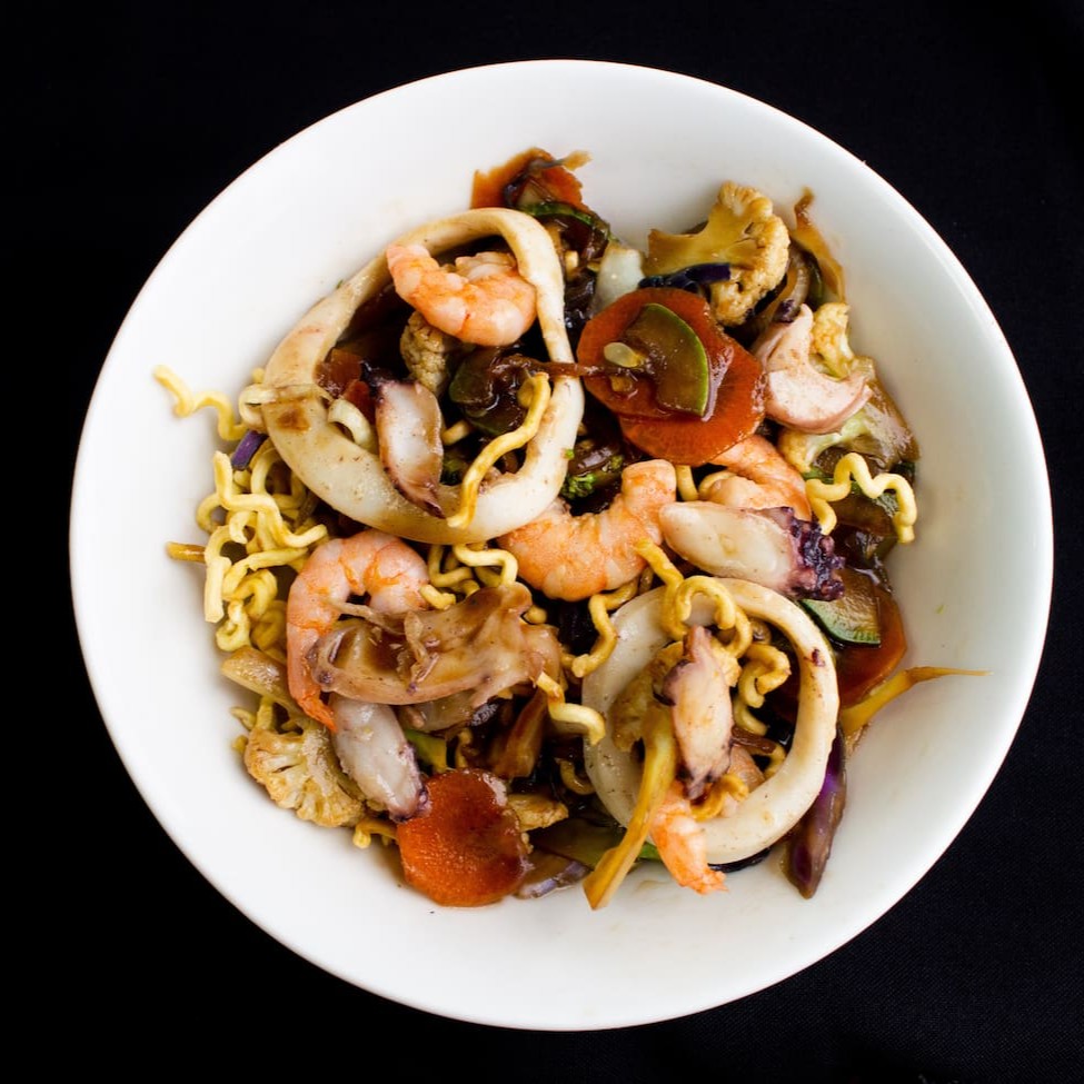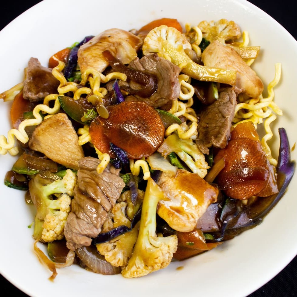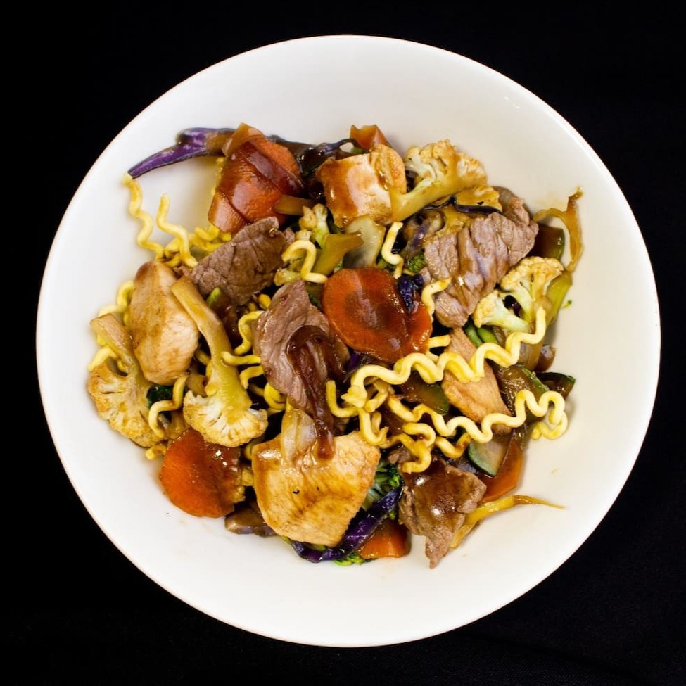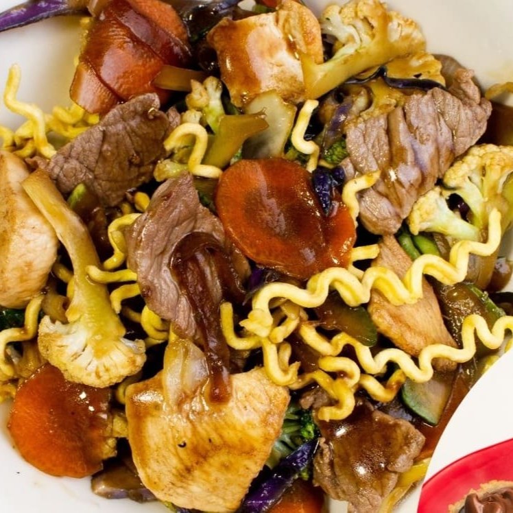 Yakisoba tradicional com Macarrão Frito, legumes mistos(couve-flor, brocolis, abobrinha, cenoura, repolho, cebola, acelga) ao molho da casa e proteína a sua escolha! (Mignon e Camarão).