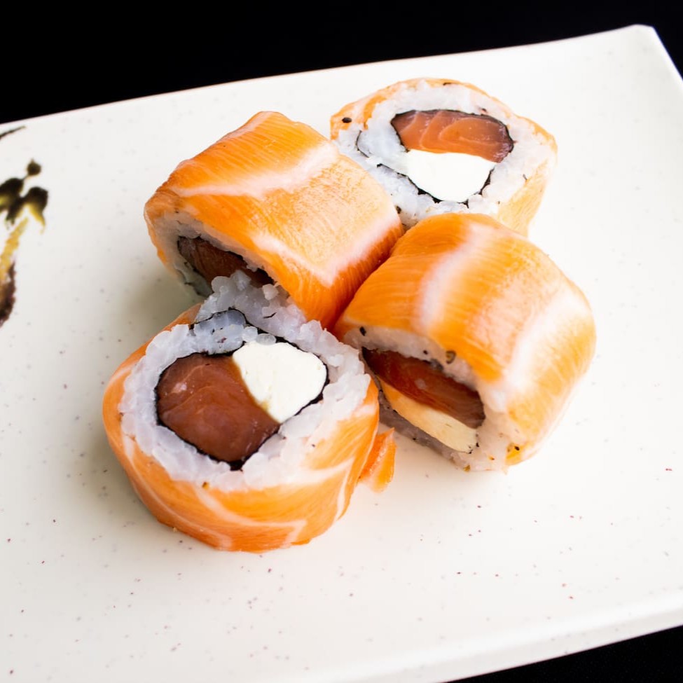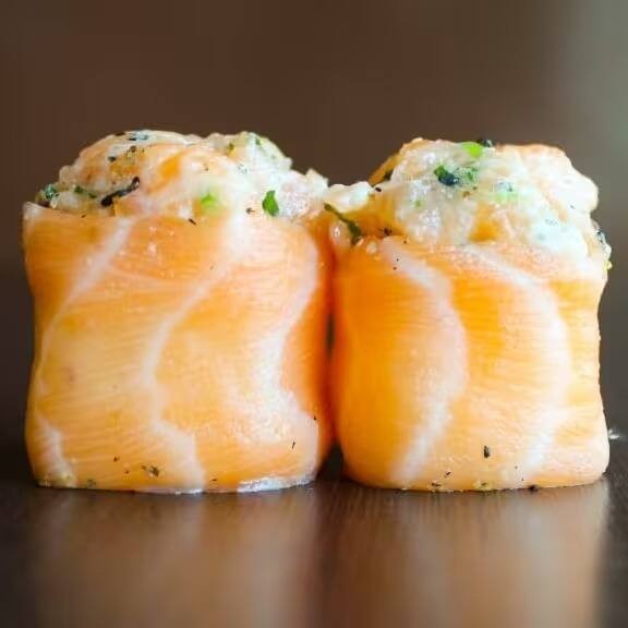 Recheado com salmão e cream cheese, enrolado no salmão.