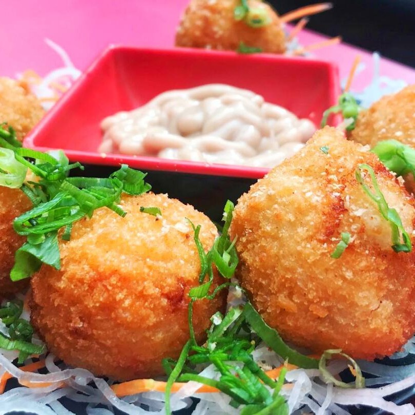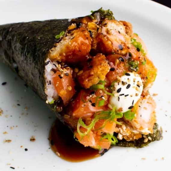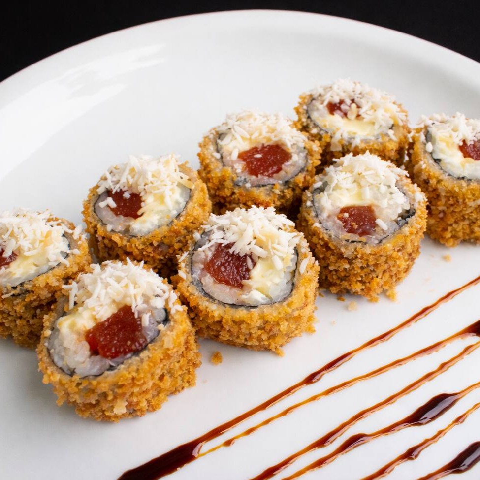 Sushi frito inteiro, recheado com salmão, cream cheese e couve crispy finalizado com molho tarê. Individual.