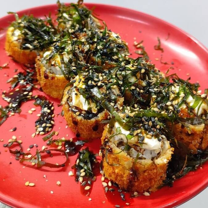 Sushi frito crocante, alga inteira. Recheado com salmão e cream cheese com couve crispy finalizado com molho tarê. Molho enviado a parte.