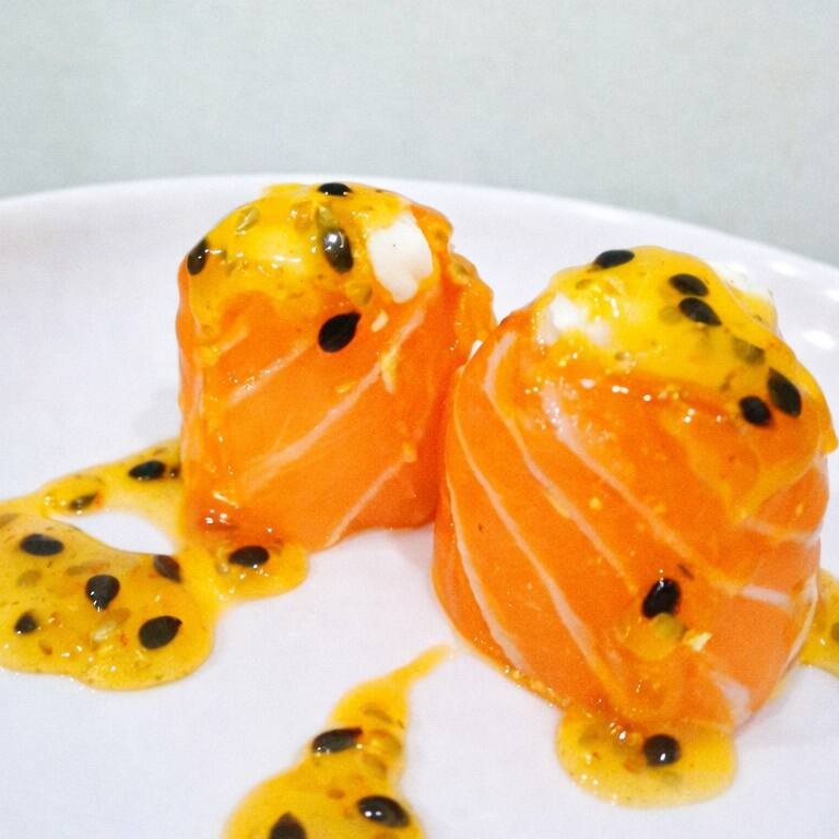 Enrolado no salmão, arroz, cream cheese e finalizado com geléia de maracuja do chef!