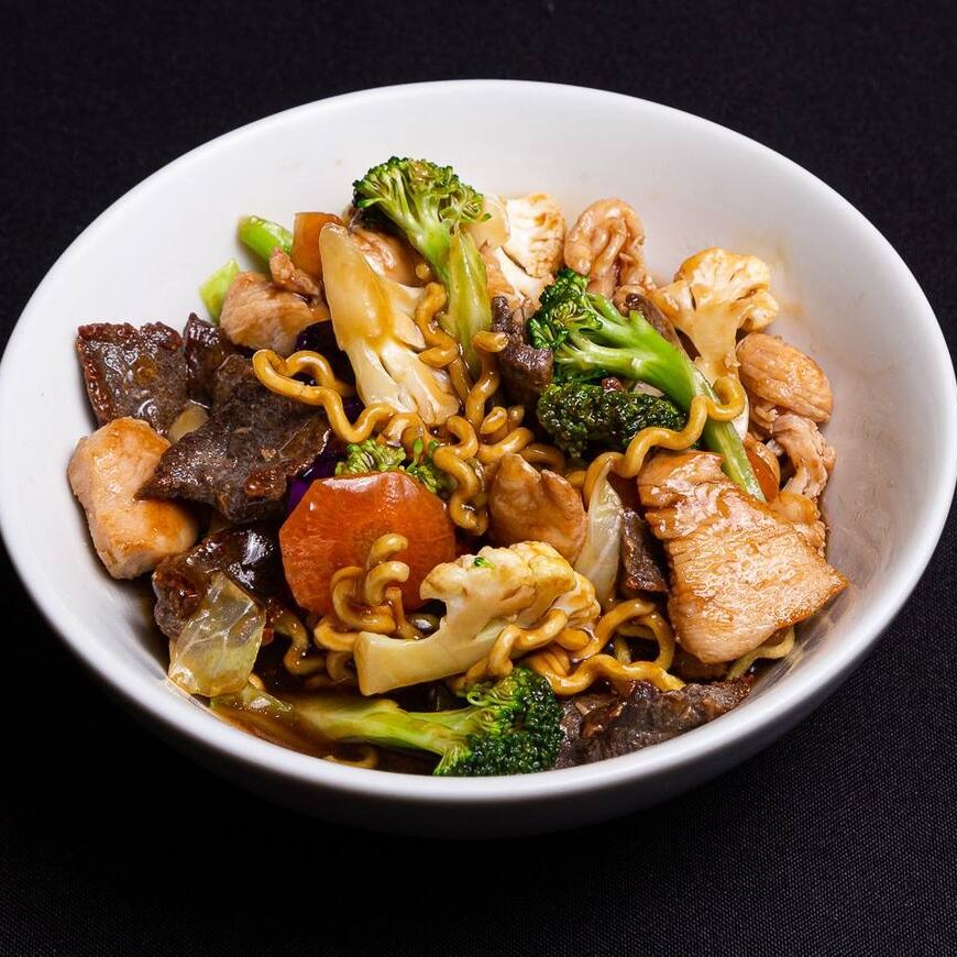 Yakisoba tradicional com Macarrão Frito, legumes mistos(couve-flor, brocolis, abobrinha, cenoura, repolho, cebola, acelga) ao molho da casa e proteína a sua escolha! (Mignon e Frango)