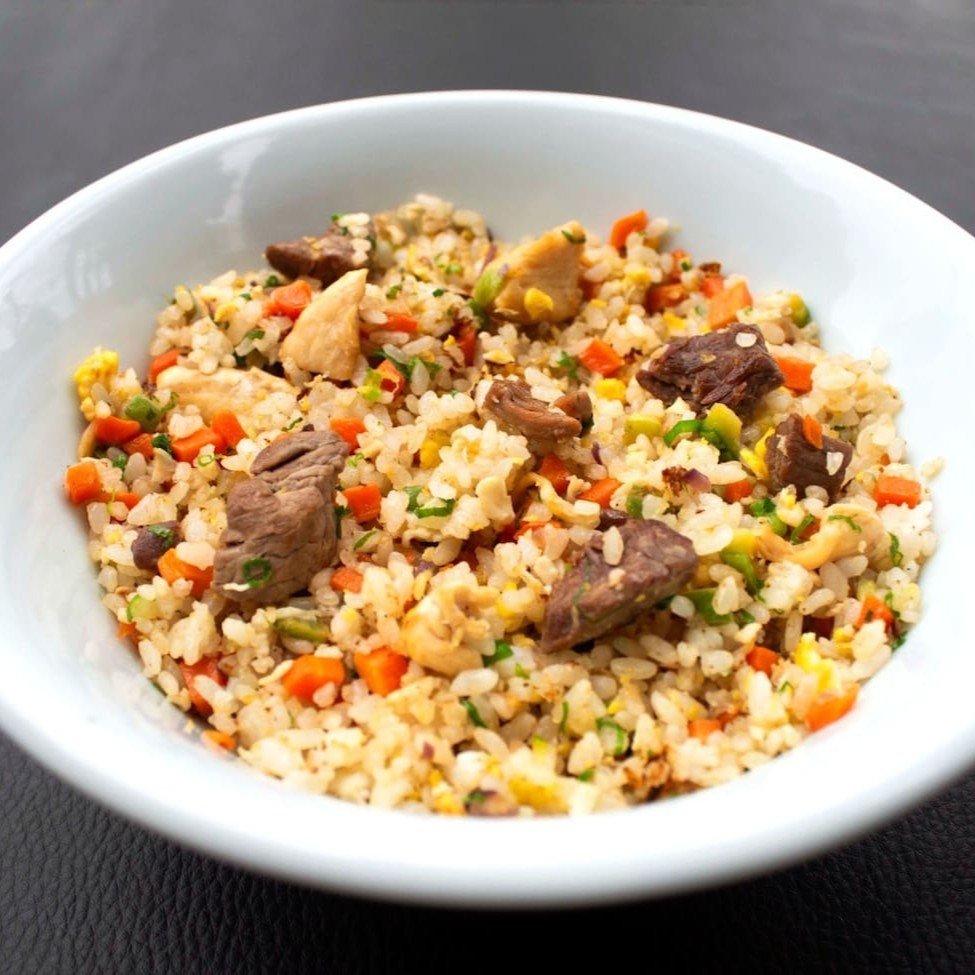 400g - Gohan (arroz branco japonês) temperado com legumes (cenoura, cebola e abobrinha), mignon, frango, ovo e finalizado com cebolinha.