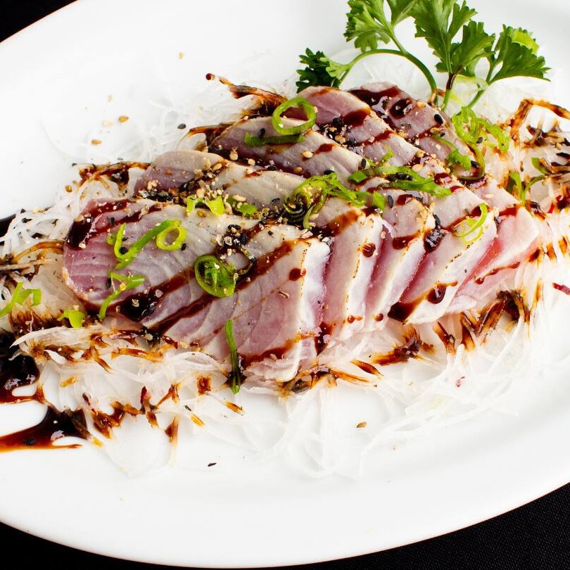 Sashimi de atum maçaricado, com gergelim e cebolinha, finalizado com molho tarê!