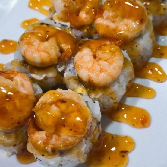 Uramaki recheado com cream cheese, camarão na manteiga e alho, finalizado com cebolinha. Sugestão de molho: Geléia de pimenta.