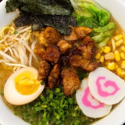 Nosso lámen é a base de caldo de peixe com missô. Uma massa fina, 100g de frango ao shoyu, milho verde, cebolinha, alga nori, moyashi, acelga, kamaboco e ovo à mollet. Porção individual, em torno de 400g.