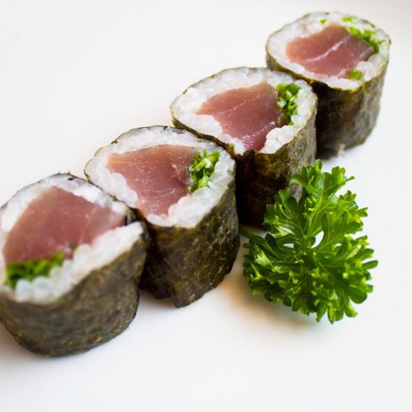 Sushi fino, com alga por fora recheado com atum.