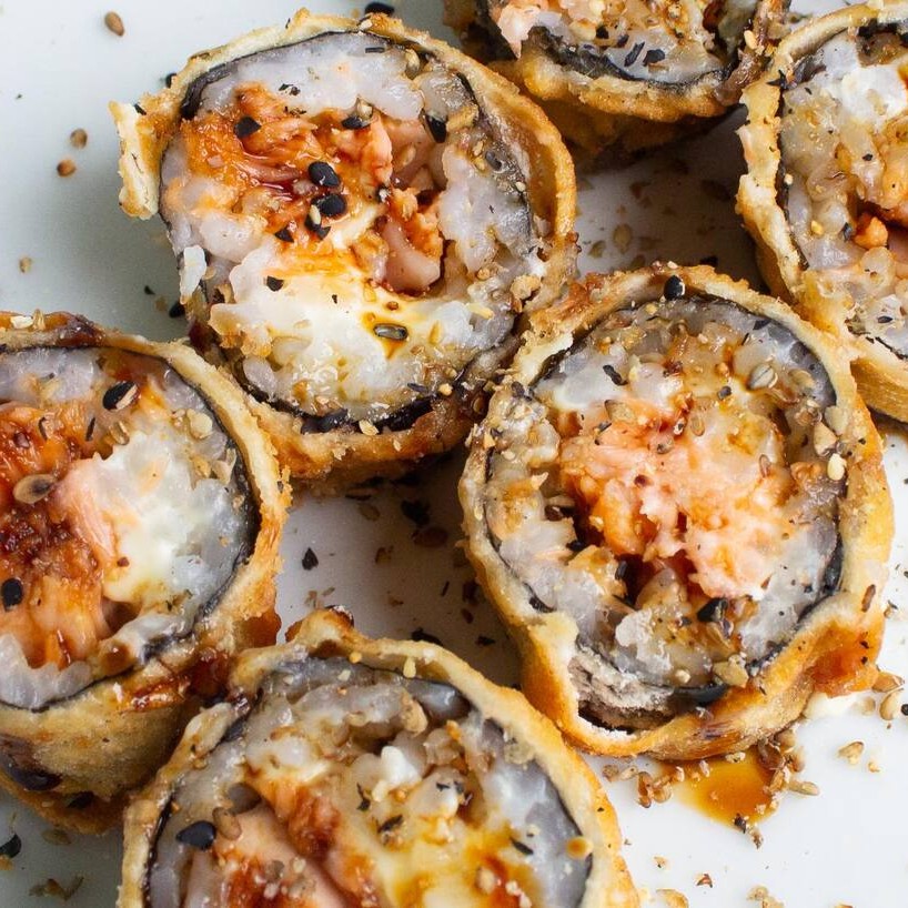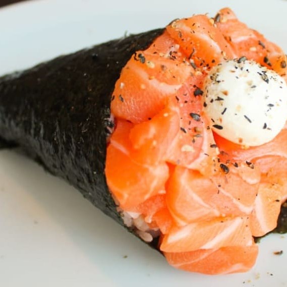Enrolado no salmão, recheado com arroz, crem cheese e crispy de batata doce crocante. Acompanha molho tarê.