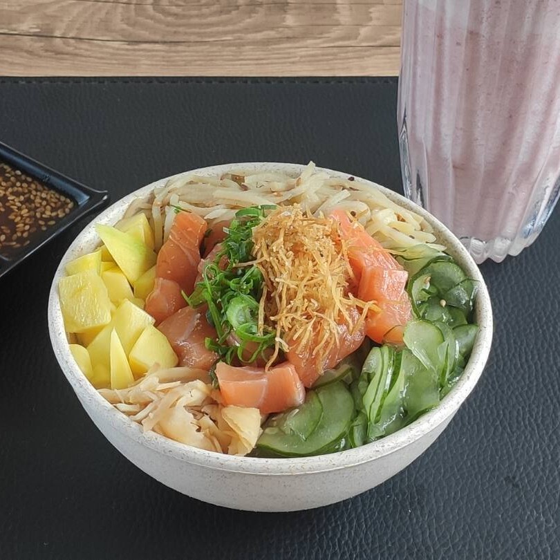 100g de proteína, crispy de batata doce, cebola roxa, gengibre, sunomono, morango e manga.