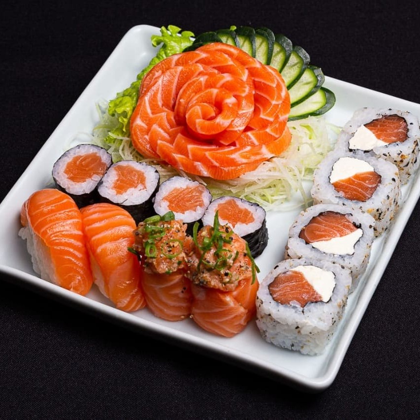 36 unidades - 8 fatias de salmão, 4 nigiris, 4 sushi joe, 4 salmão filadélfia, 4 Filadelfia especial, 4 shake, 4 skin especial e 4 maki joe.
