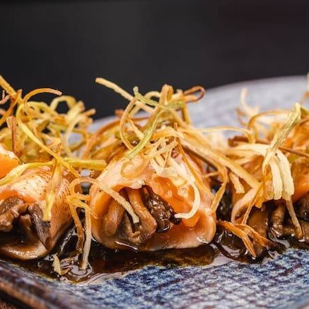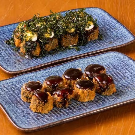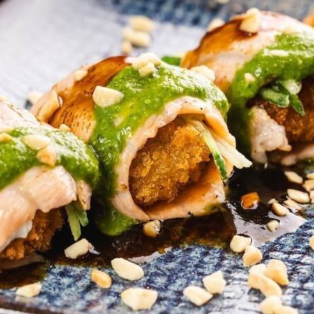 Hossomaki empanado e frito de salmão e cream cheese, coberto por couve crispy e tarê.