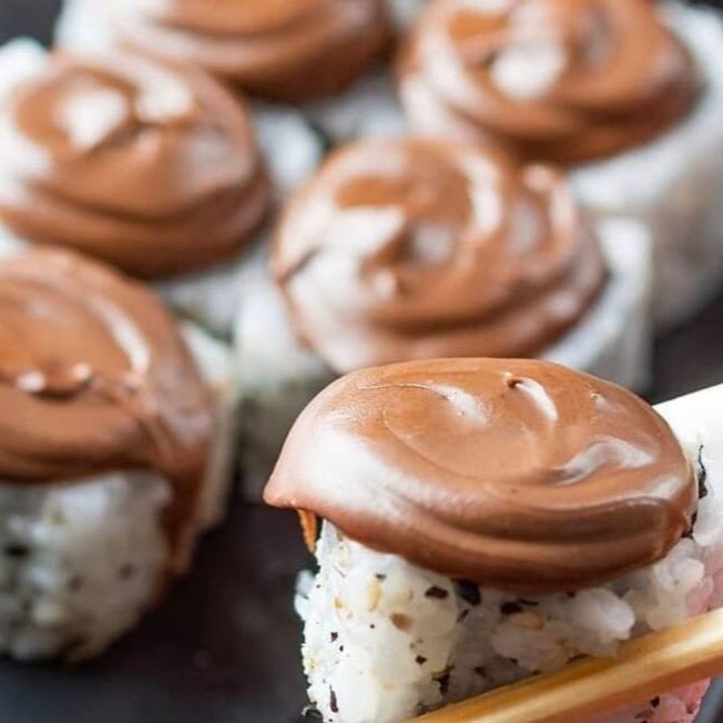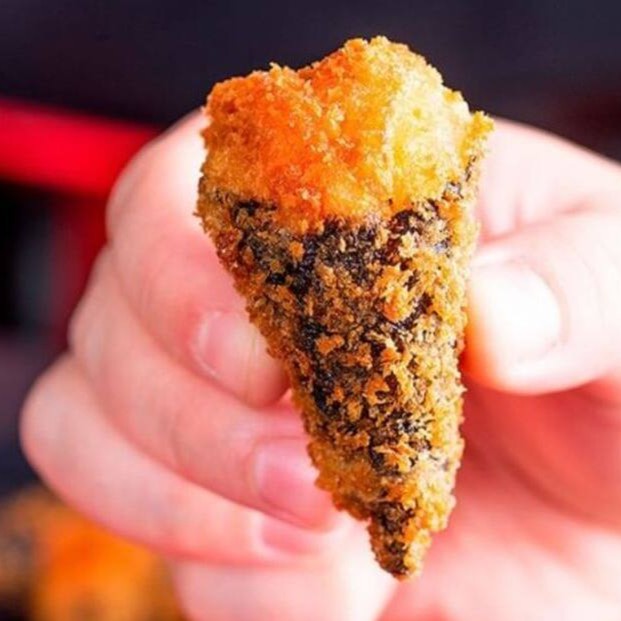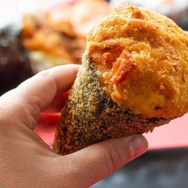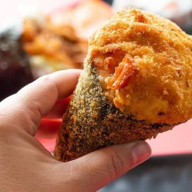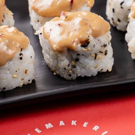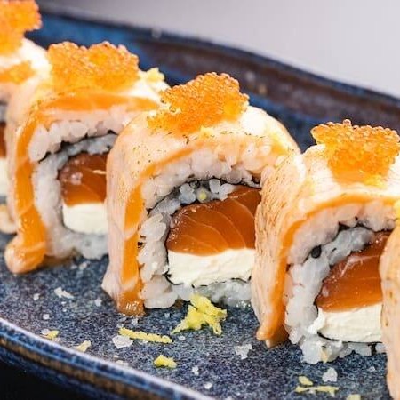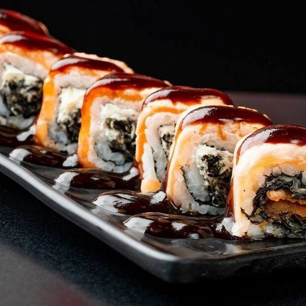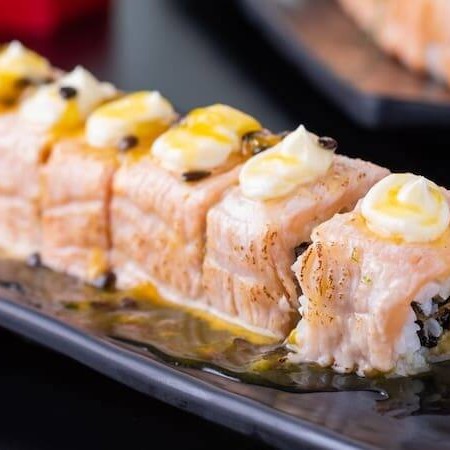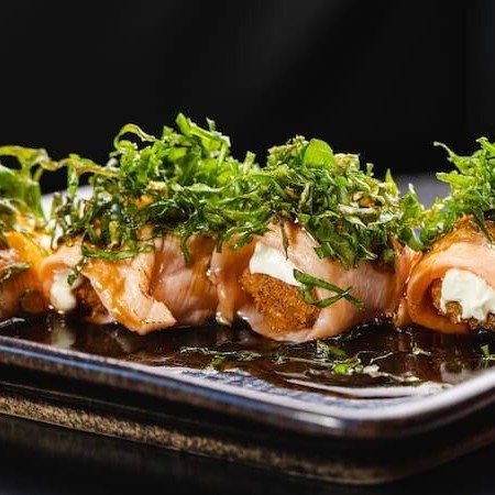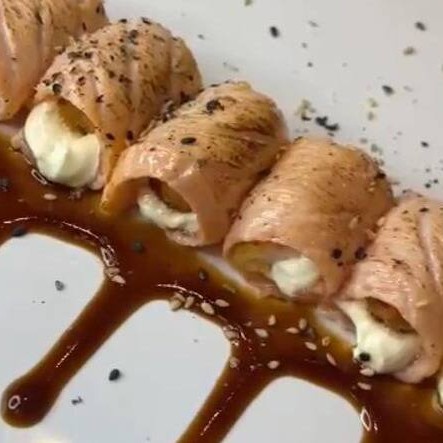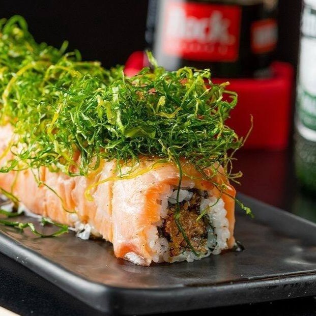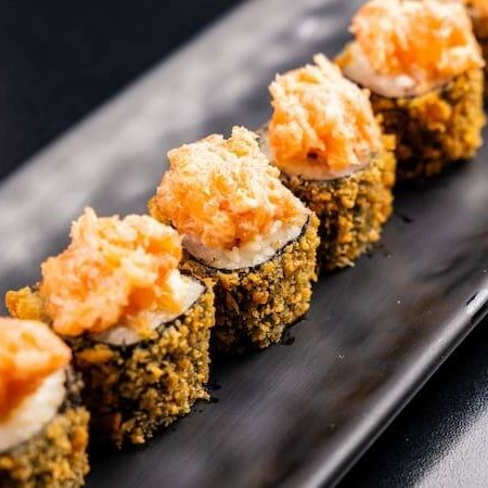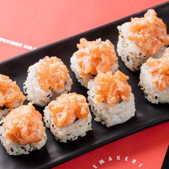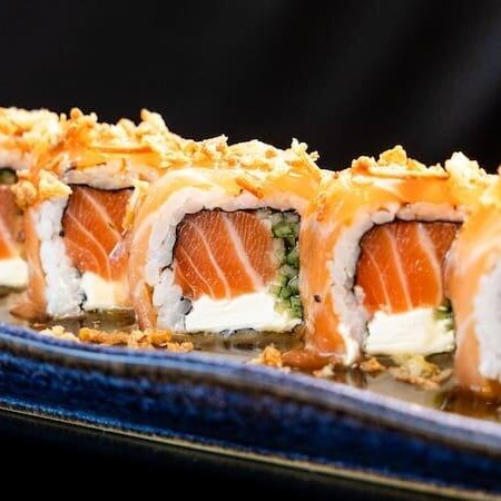 Sushi de salmão fresco e cream cheese, empanado em panko e frito, coberto com salmão fresco batido com cream cheese.