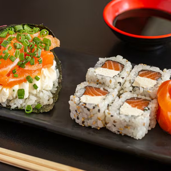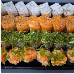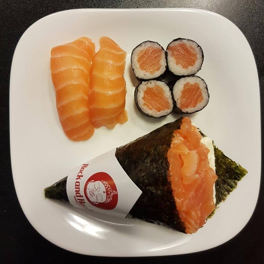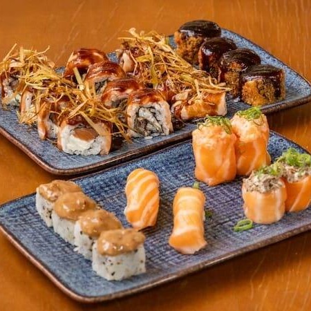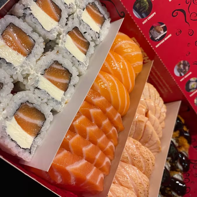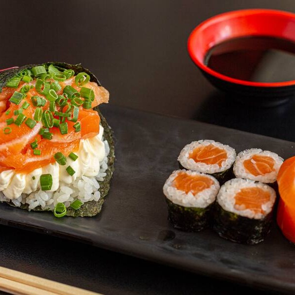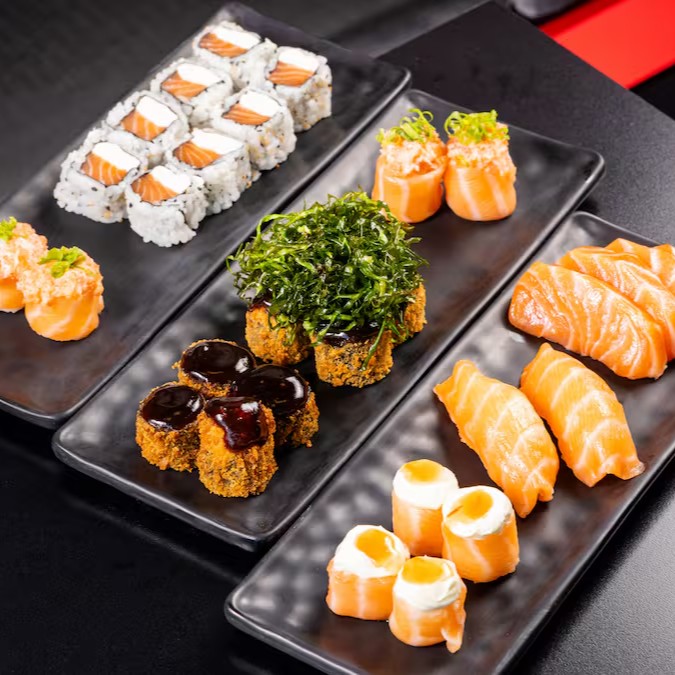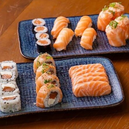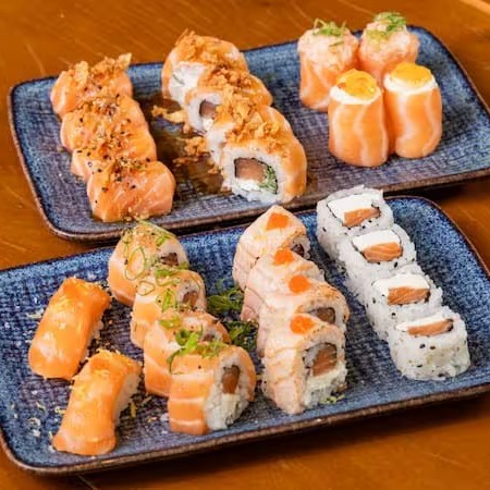 10 unidades Uramaki Filadelfia, 10 unidades uramaki salmão crock cream cheese e geleia de pimenta finalizado com gergilim, 10 unidades hossomaki de salmão grelhado com tartar de salmão fresco, 10 unidades sushi hot filadélfia.