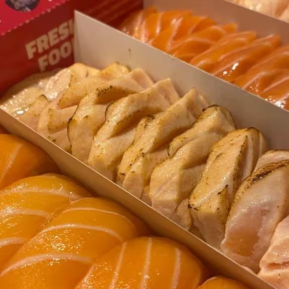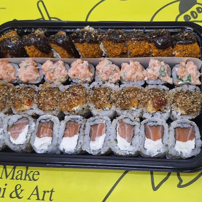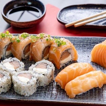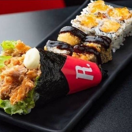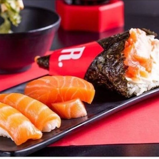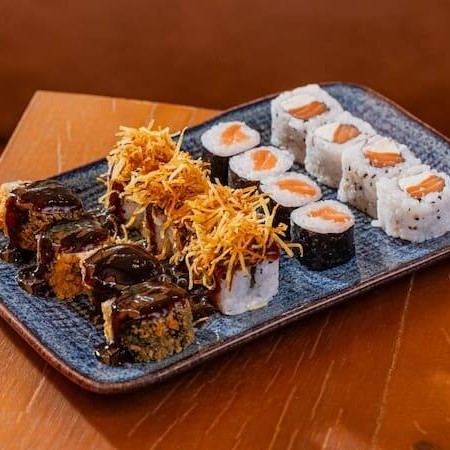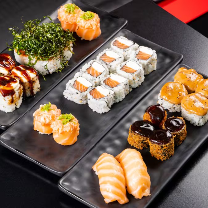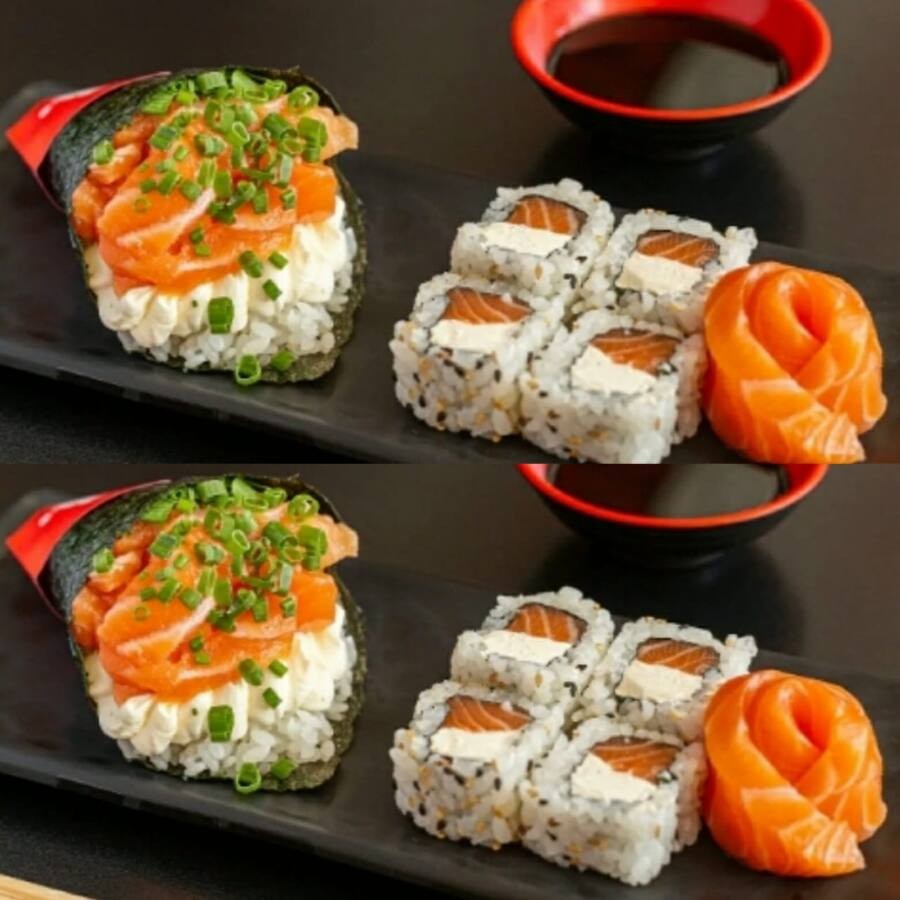 10 unidades Uramaki Filadelfia, 10 unidades uramaki salmão crock cream cheese e geleia de pimenta finalizado com gergilim, 10 unidades hossomaki de salmão grelhado com tartar de salmão fresco, 10 unidades sushi hot filadélfia.