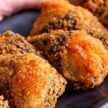 Hossomaki empanado e frito de salmão e cream cheese, coberto por tarê.