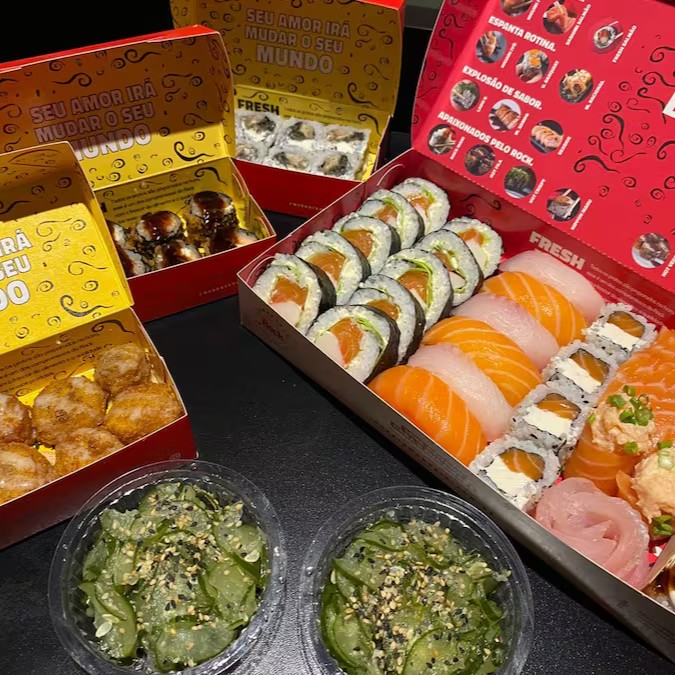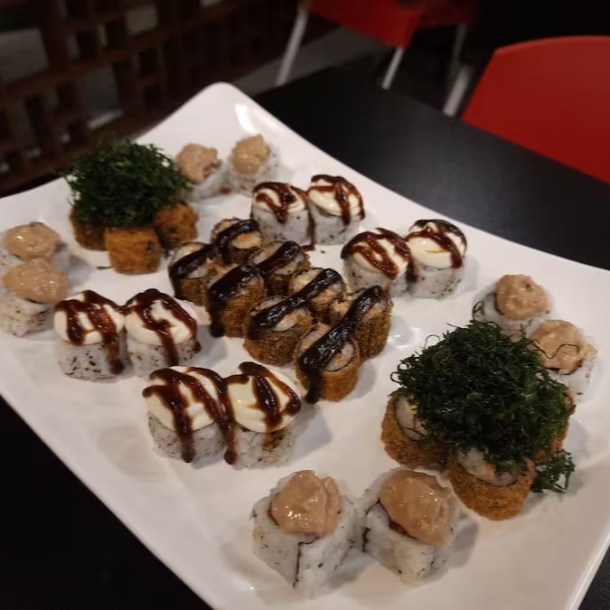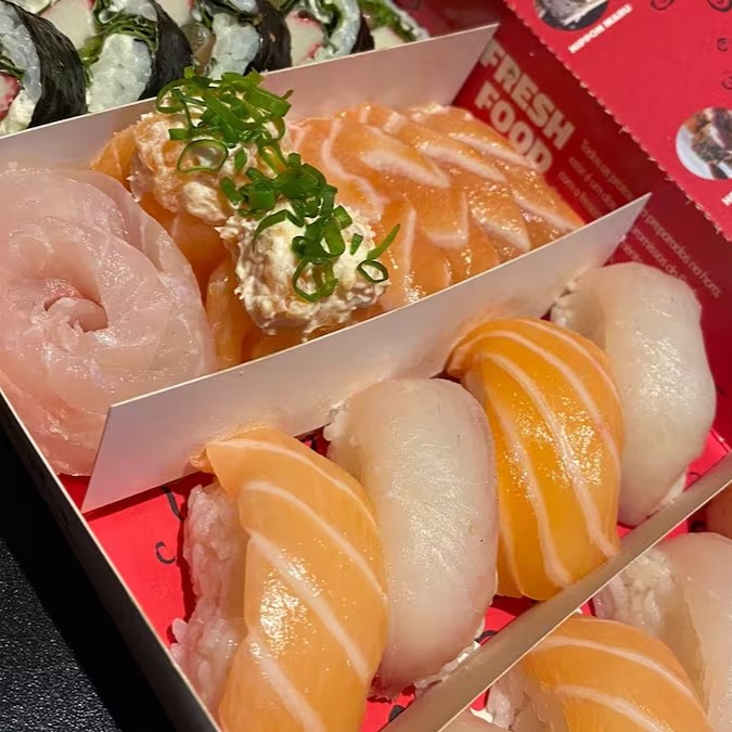 8 Shakemaki, 4 Uramaki filadelfia, 4 Skin plus, 4 Hot filadélfia, 4 Hot crispy, 2 Niguiri salmão