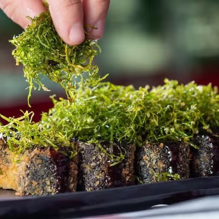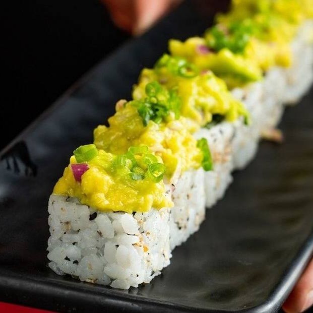 Uramaki de Pepino, coberto por creme cítrico de abacate com cebola roxa e finalizado com cebolinha.