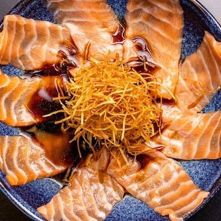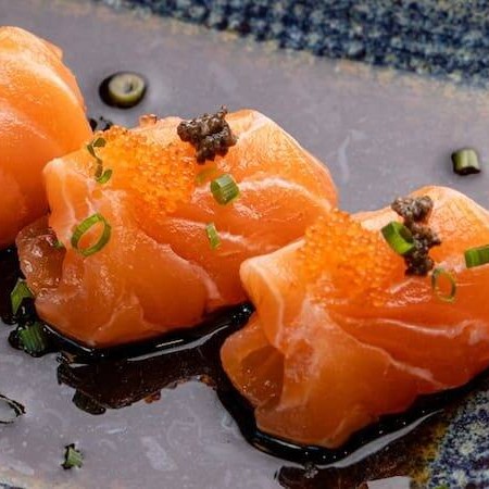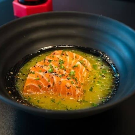 5 lâminas de sashimi de salmão, acompanhadas de emulsão de laranja, azeite, wasabi e sal.