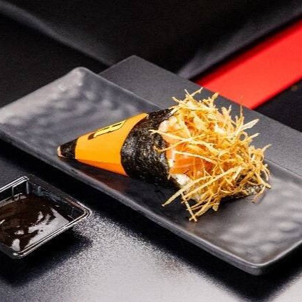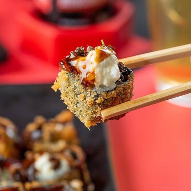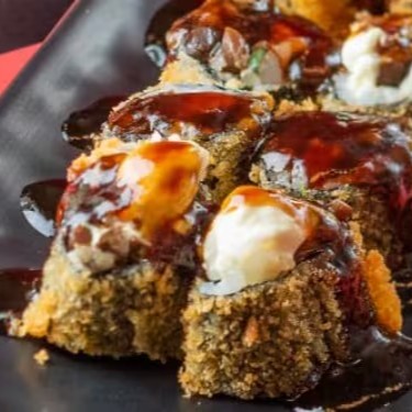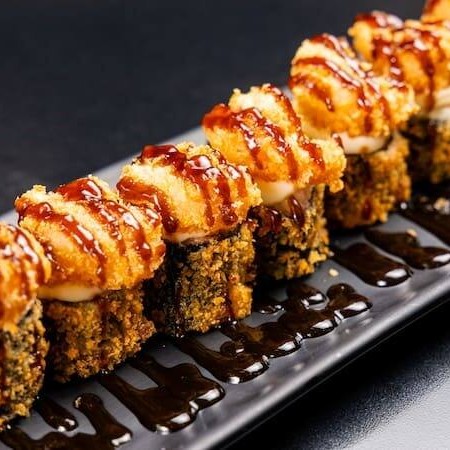 Sushi de salmão fresco e cream cheese, empanado em panko e frito, coberto com requeijão, camarão empanado e molho tare.