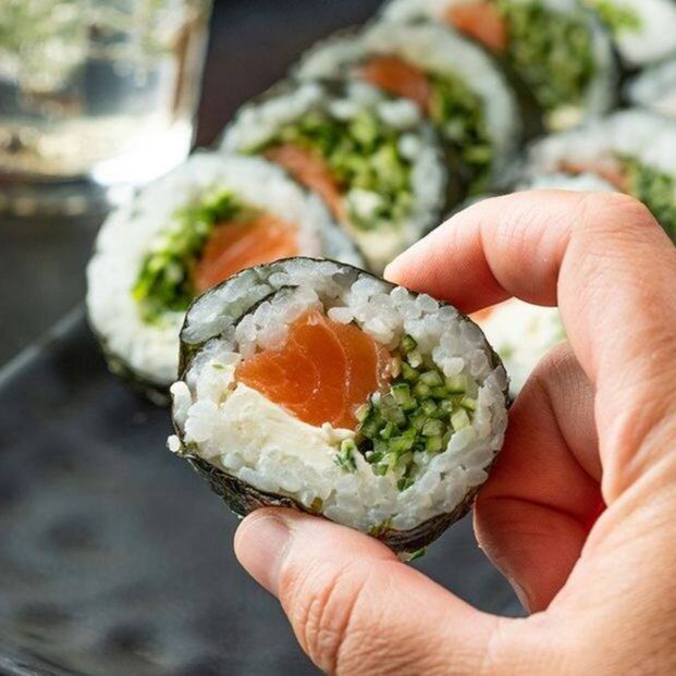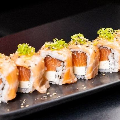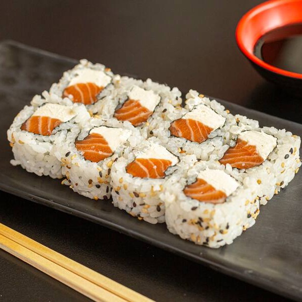 Sushi enrolado grosso com Salmão fresco, pepino e cream cheese.