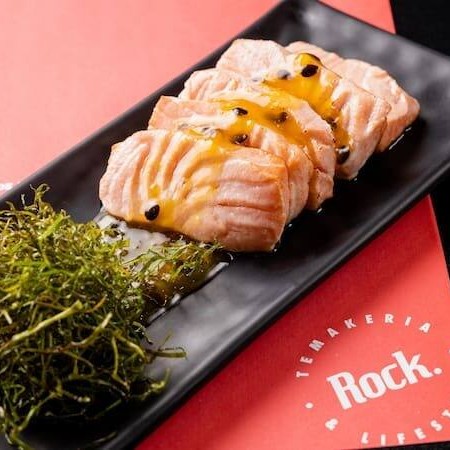 5 lâminas de Salmão, levemente maçaricadas, com Molho de maracujá e Couve crispy.
