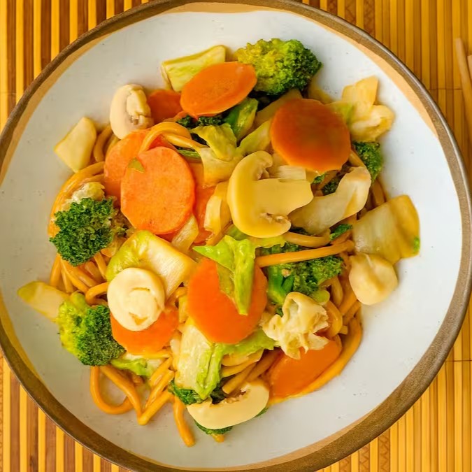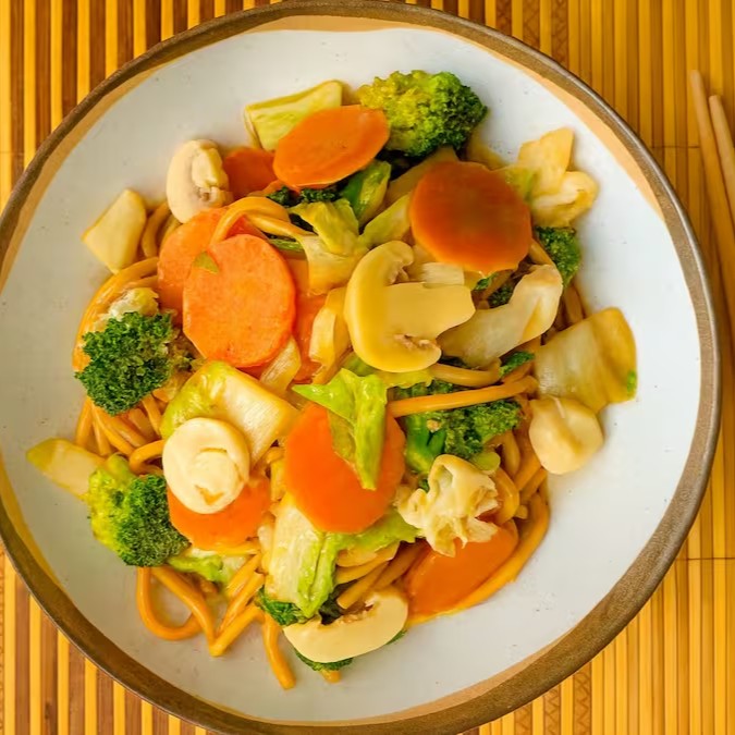 Macarrão Udon Misturado com, Acelga, Brócolis, Cogumelos, Repolho e Cenoura com o Clássico Molho da Casa. Preparado no Wok Chinês com Ingredientes Frescos. À Base de Shoju.