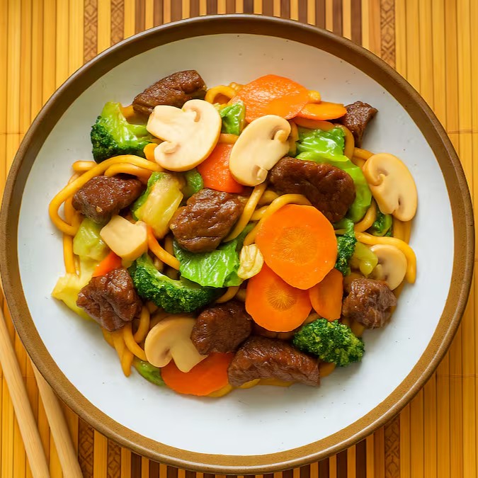 Macarrão Udon com, Carne, Acelga, Brócolis, Cogumelos, Repolho e Cenoura com o Clássico Molho da Casa. Preparado no Wok Chinês com Ingredientes Frescos. À Base de Shoju.