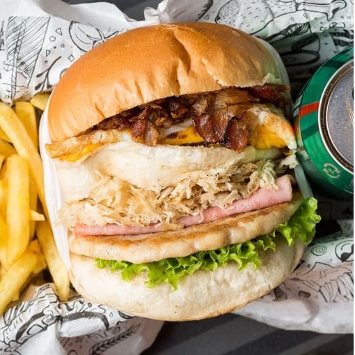 Pão,maionese,queijo e presunto,hambúrguer,alface e tomate, calabresa,frango,bacon e ovo.