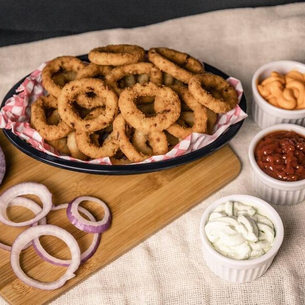 Desfrute dos nossos 'Anéis de Cebola', uma deliciosa opção na categoria 'Porções'. São 16 unidades de anéis de cebola cuidadosamente selecionadas, envoltas em uma camada crocante de empanado e fritas até atingirem a perfeição dourada. O sabor intenso e a textura única prometem uma experiência gastronômica inigualável. O prazer de uma porção generosa, perfeita para compartilhar com amigos ou saborear sozinho. Aproveite!