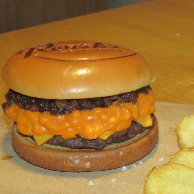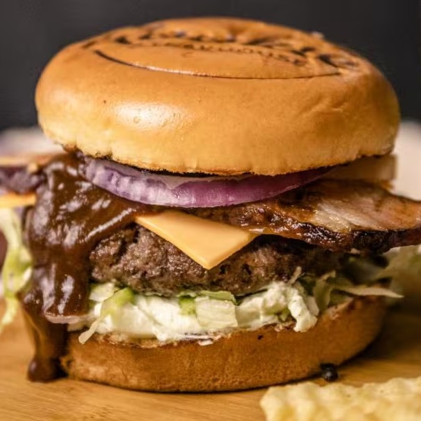 Pão de brioche,hamburguer artesanal 100g,duas fatias de cheddar,creme cheddar puro e geleia de bacon da casa.