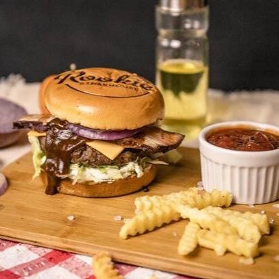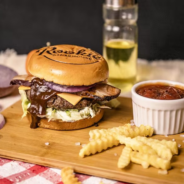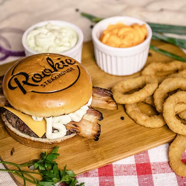 O 'Combo Rookie' é uma refeição robusta, perfeita para saciar qualquer tipo de fome! Se deleite com um pão de brioche macio ou crocante, recheado com dois suculentos hambúrgueres artesanais de 150g cada, ricamente cobertos com fatias de queijo cheddar derretido. Acompanhado por quatro fatias de um rústico e saboroso bacon artesanal e uma cebola caramelizada que aguça o paladar. Para completar, desfrute de aproximadamente 150g de batatas fritas crocantes e uma bebida refrescante em lata. Este combo é uma verdadeira experiência gastronômica!