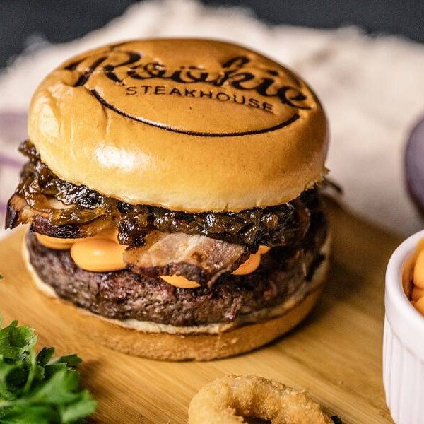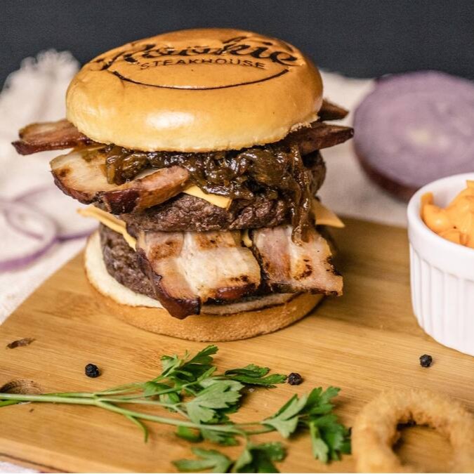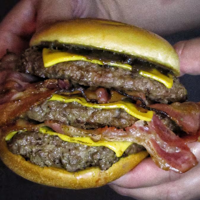 Mata qualquer fome (pão brioche ou crocante, 2 hambúrgueres artesanais de 150 gr, fatias de queijo cheddar, quatro fatias de bacon artesanal rustico, cebola caramelizada)