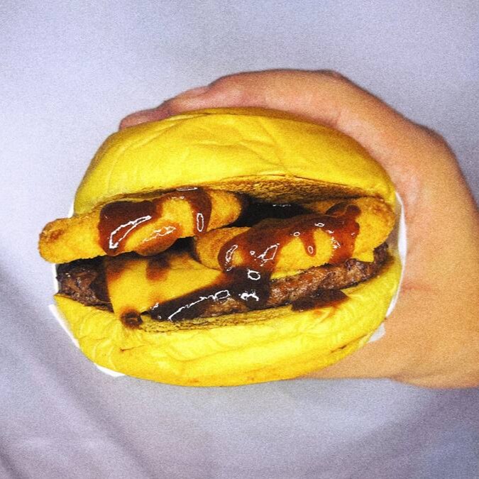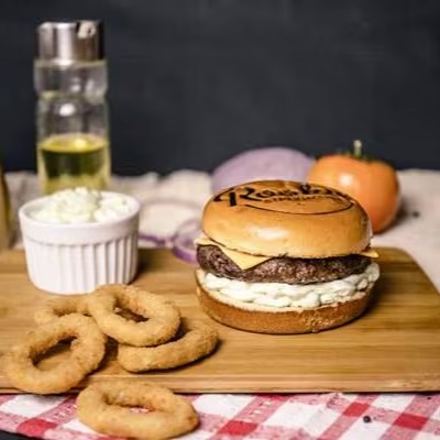 Barbecue e Onions (pão de brioche, hambúrguer artesanal de 100gr, fatia de cheddar, onion rings e molho barbecue)