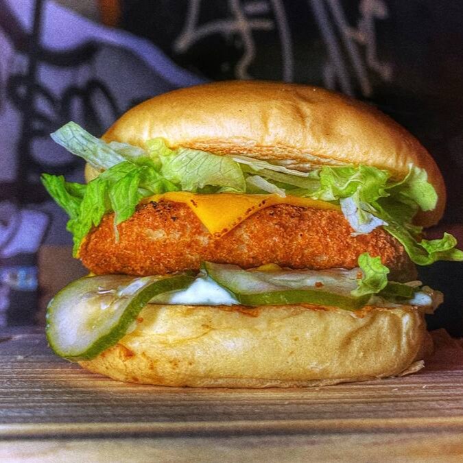 E pra quem gosta de um peixinho, Pão brioche ou crocante, Maionese Artesanal, Mostarda, Picles, Empanado de tilápia, cheddar fatia e alface americana.