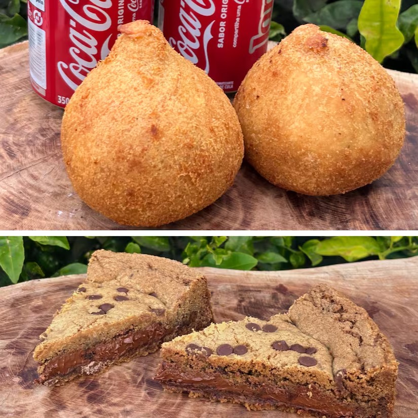 Leve duas fatias de mais deliciosa torta cookie de Nutella, duas coxinhas de requeijão, fritas na hora, e duas cocas para acompanhar.