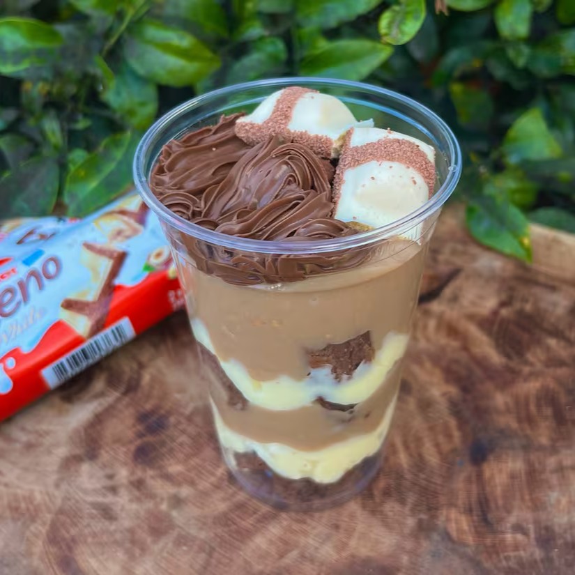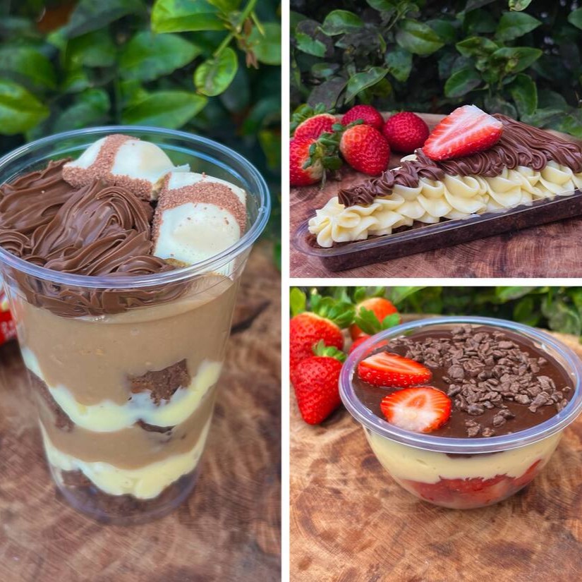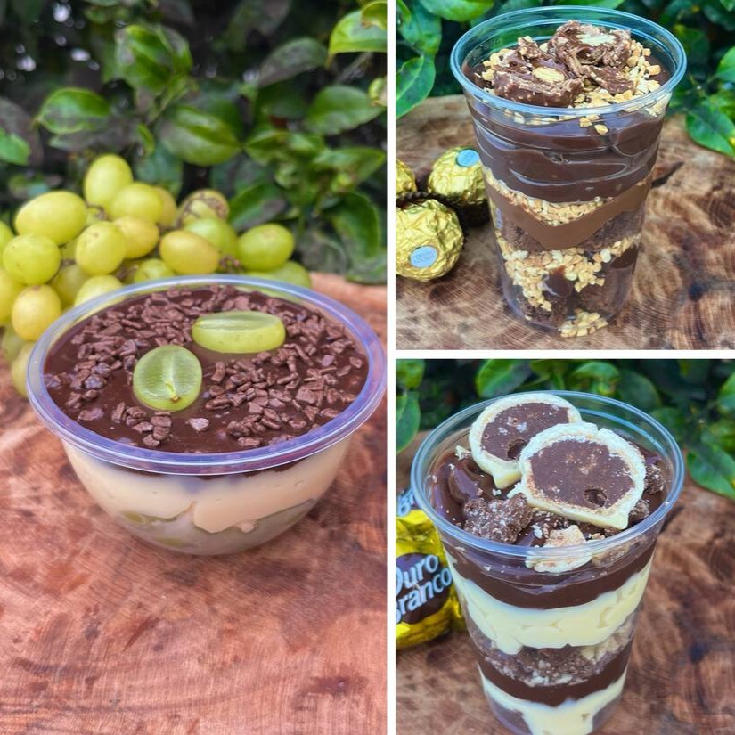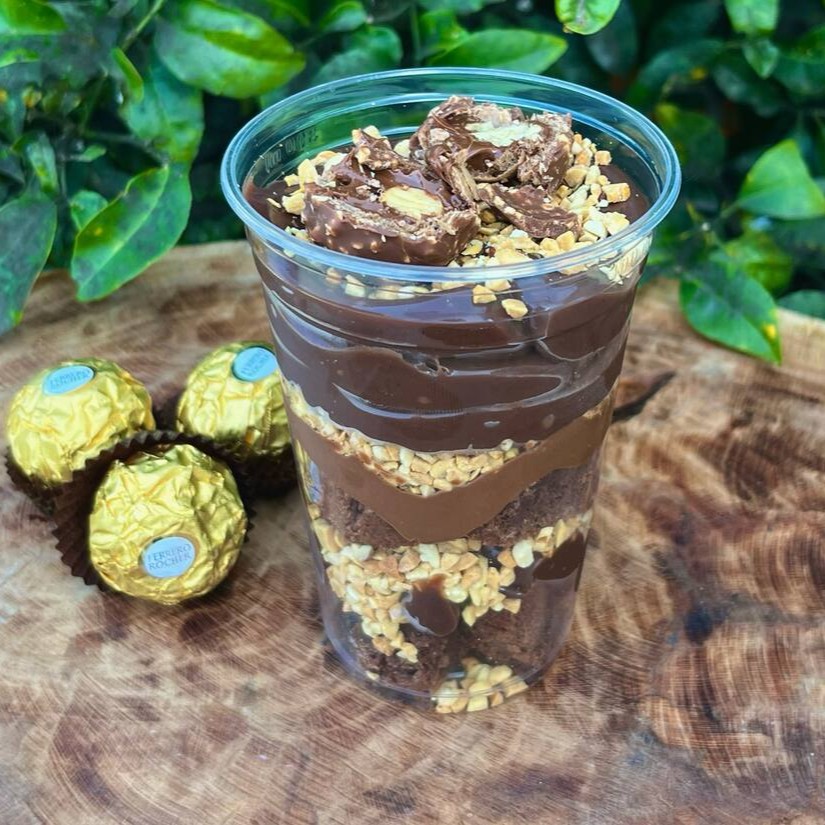 Leve um delicioso bombom no potinho de morango, uma delicia no copo de Kinder bueno super recheado e uma fatia de brownie com Muitaaa cobertura.
