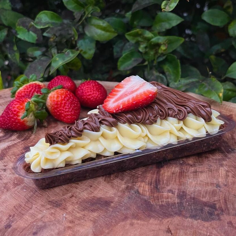 Uma fatia de brownie super fofinho com cobertura de creme de Ninho super cremoso e uma camada generosa de Nutella, finalizado com um morango!!