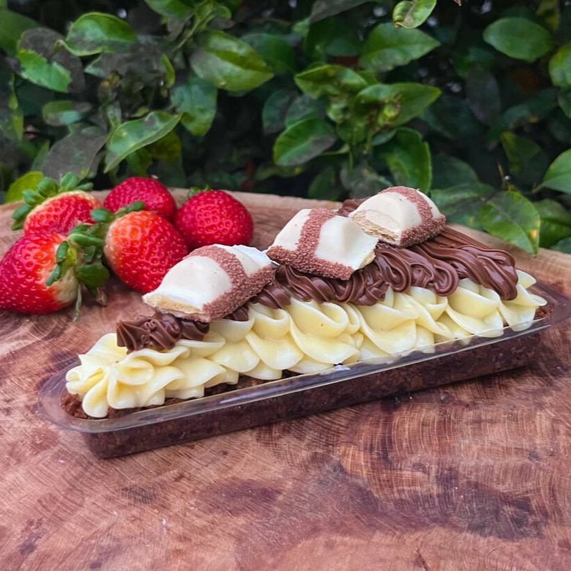Uma fatia de brownie fofinho com cobertura de creme de Ninho super cremoso, uma camada generosa de Nutella, finalizado com Kinder Bueno!!