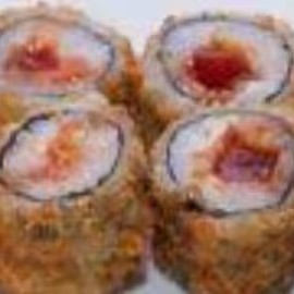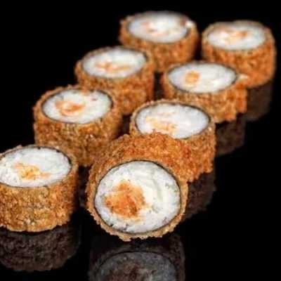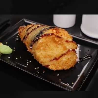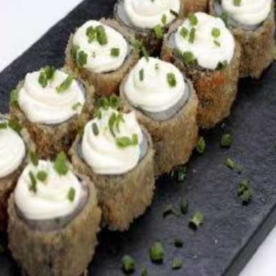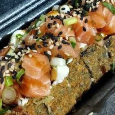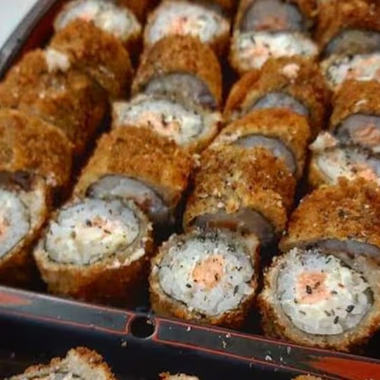 Sushi recheado com patê de salmão e creme cheese, empanado na panko e frito