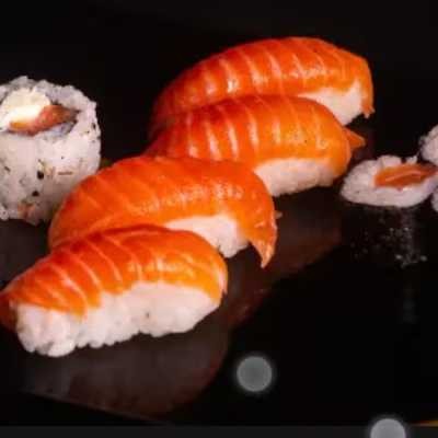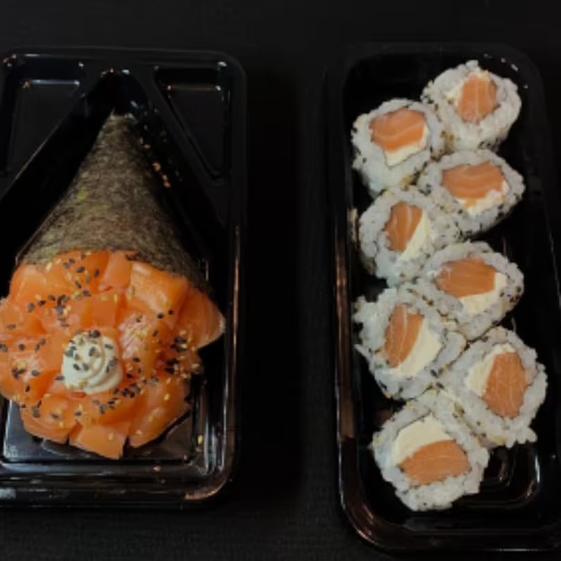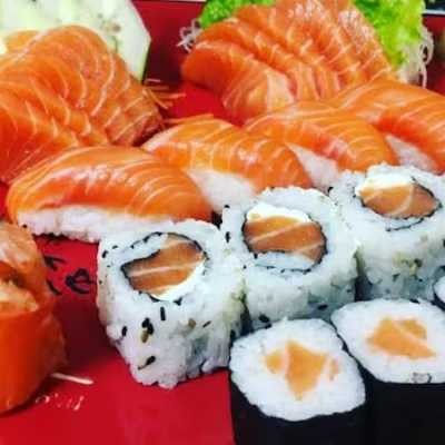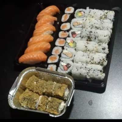 5 sashimi salmão, 2 niguiris de salmão, 8 shake makki, 8 uramaki filadélfia e 8 hot filadélfia