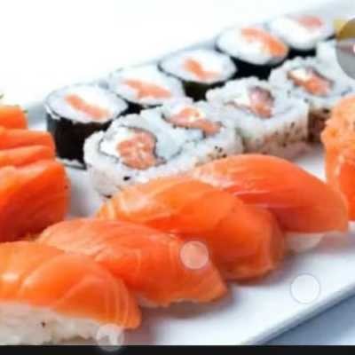 5 sashimi de salmão, 2 niguiris de salmão, 8 shakemaki, 8 uramaki filhadefia, 8 hot filadélfia