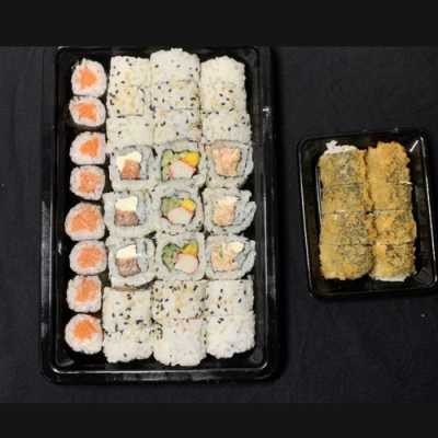 8 uramaki de salmão grelhado, 8 uramaki filadélfia, 8 uramaki california, 8 salmon maki e 8 hot filadélfia