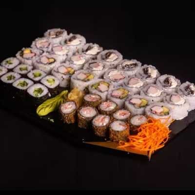 8 uramaki patê de salmão, 8 uramaki california, 8 uramaki romeu e julieta (sem morango), 8 hossomaki e 12 hot filadélfia