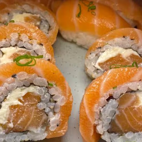 8 unidades de uramaki com salmão, cream cheese e salmão em cima