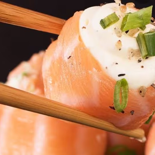 Sushi recheado com patê de salmão e creme cheese com cebolinha por cima