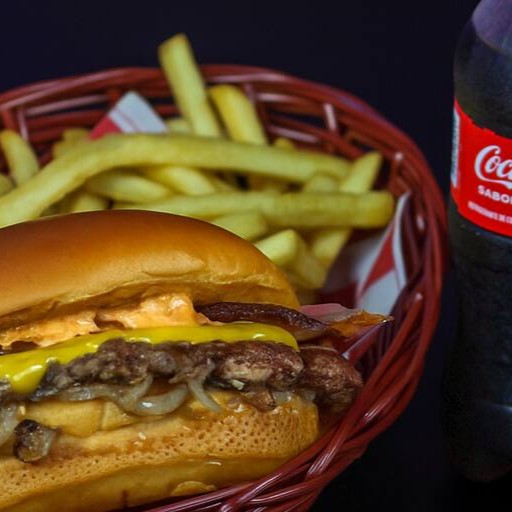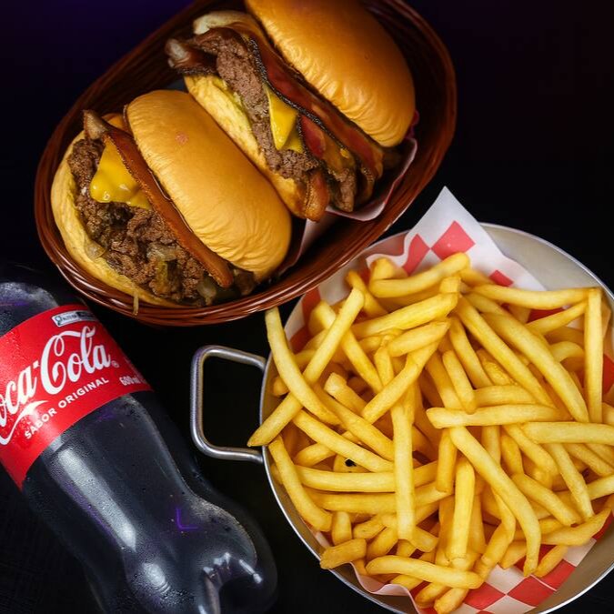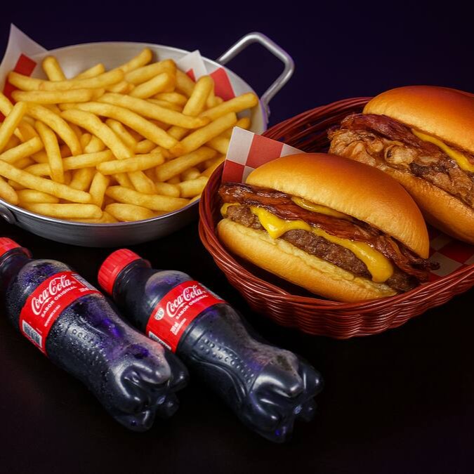 Pão brioche amanteigado, dois hambúrguer de 90g, cebola carameliza, queijo cheddar, Quatro fatias de Bacon crocantes e generosas e molho Bbq + 2 Peck de Fritas + Refri de 600 Ml.