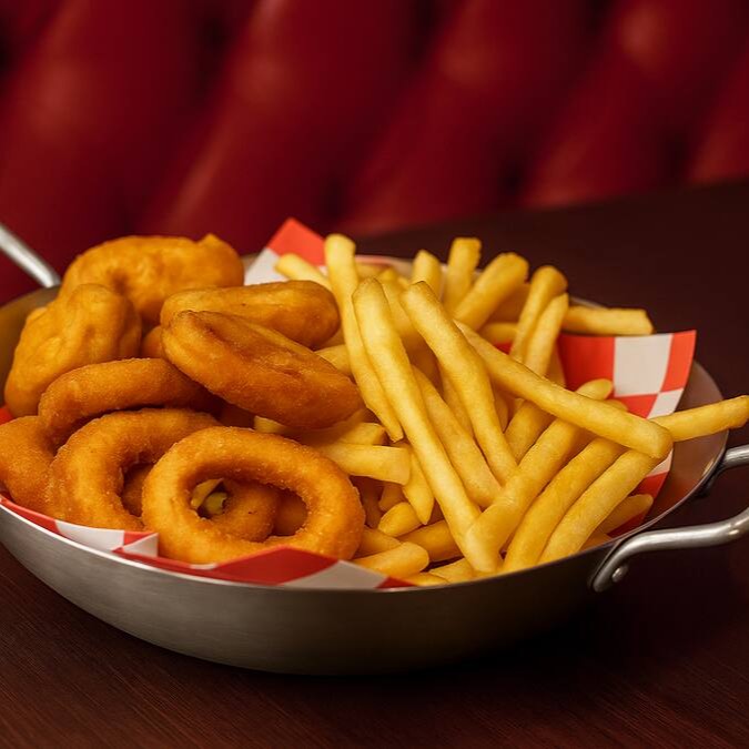 Desfrute de nosso 'Box Food, Um mix de porções perfeitamente preparado para aquecer a sua noite com um toque de capricho. A deliciosa combinação inclui 8 anéis de cebola crocantes, 8 Nuggets de frango dourados e suculentos, e 175g de batatas fritas, crocantes por fora e macias por dentro.