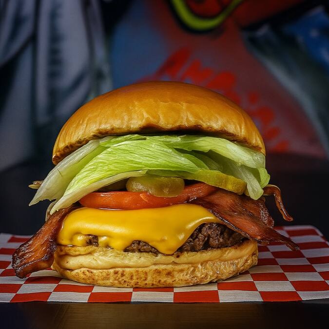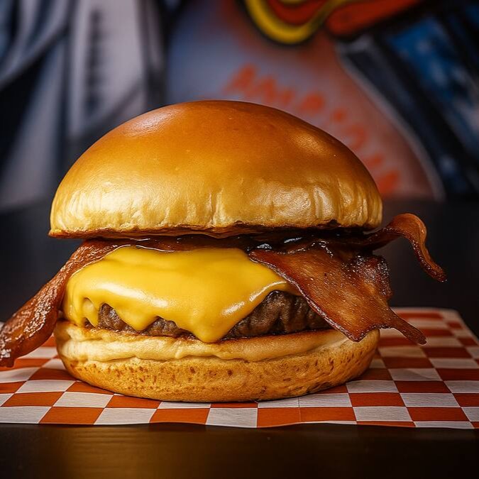 Pão brioche amanteigado, hambúrguer de 90g, Cebola, Queijo cheddar em Dobro, Duas fatias de Bacon crocantes e generosas e molho Chiplote Picante.