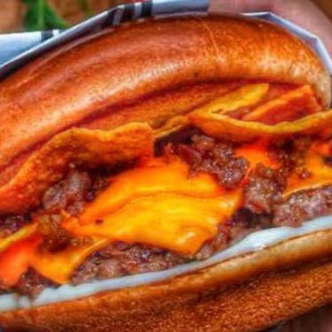 Pão brioche amanteigado, dois hambúrguer de 90g, Queijo cheddar, Farofa de Bacon, Molho Barbecue, Pimenta Jalapeno, e Aquele Doritão nos Burger.